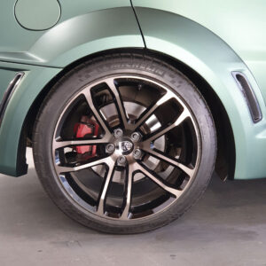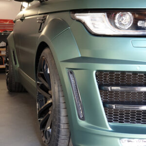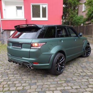 Wenn ein stilvoller Range Rover Sport zum Pitbull mutiert, dann liegt das wohl am optischen Breitbau von Lumma. Doch keine Sorge, wir haben dieses Kunstwerk wieder royaltauglich umgestaltet. Das Ergebnis? Eine perfekte Symbiose aus Stil und Kraft, gepaart mit einem Hauch very britischem Understatement. Unsere Zauberkur: ein Pine Green matt metallic, wie maßgeschneidert für diesen V8. Er ist jetzt nicht nur sehr royal, sondern auch sportlich, sehr britisch, aber auch ein bisschen Pitbull. Steht er nicht einfach grandios da, mit diesem lauernden Blick von oben?
