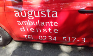 Dieser Kastenwagen bekam ebenfalls das von uns gestaltete Branding. Die Reflektorstreifen durften entfallen, da es sich um kein Einsatzfahrzeug handelt. Auch im DRK CI beschriftet, fügt er sich harmonisch in die Fahrzeugflotte ein. So soll es sein.